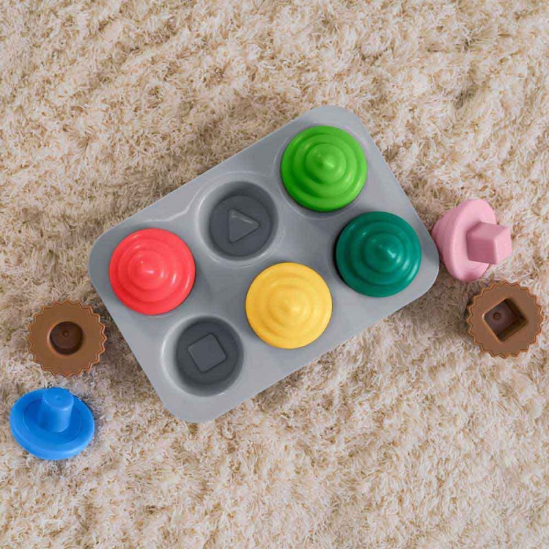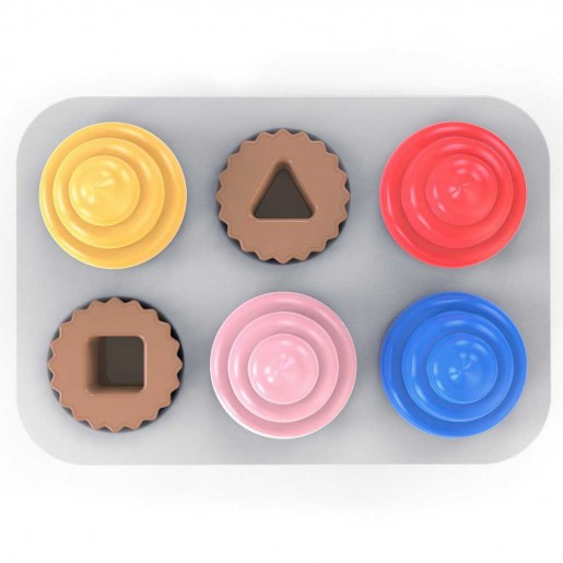 ¡Cada cupcake se almacena perfectamente en la bandeja que combina con la forma! Descubre una pizca de colores y practica formas una y otra vez.