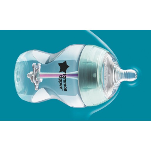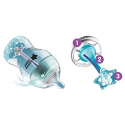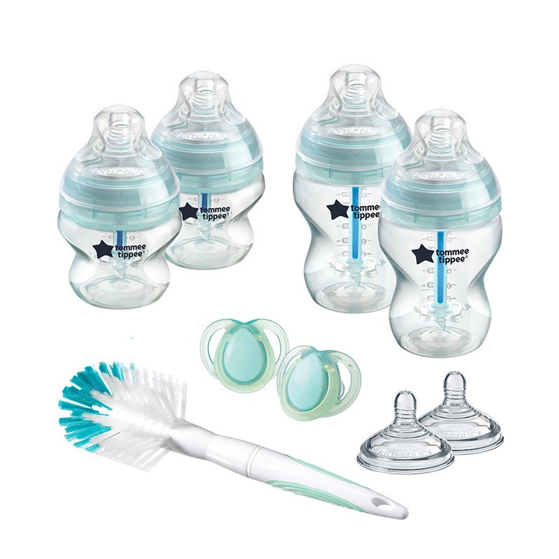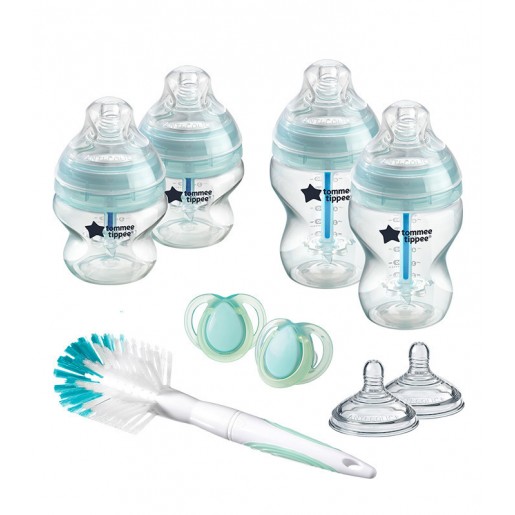 El kit de iniciación para recién nacidos Anticólico Avanzado de Tommee Tippee contiene lo necesario para los primeros meses del bebé, como biberones anticólicos de diferente tamaño, tetinas anticólicos, un cepillo para la limpieza de biberones y tetinas, y dos chupetes nocturnos aptos desde los 0 hasta los 6 meses.