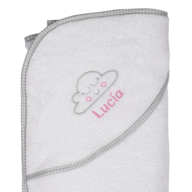 Capa de baño 100% algodón de 100cm x 100cm con un simpático diseño de Nube con Colorete al que puedes añadir un bordado en color Azul con el nombre que desee.