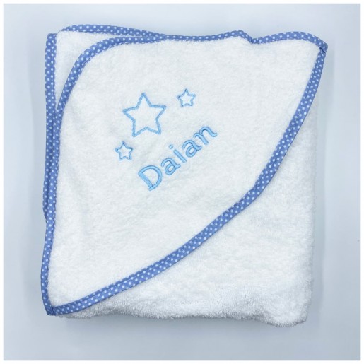 Se trata de una capa de baño fabricada 100% algodón de 100x100 cms a la que puede añadir la personalización que le guste. Está disponible con bordado en rosa o azul y en varios diseños muy originales.