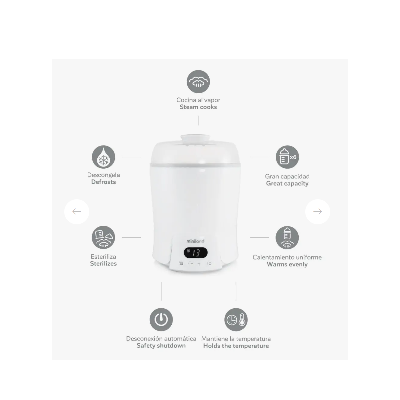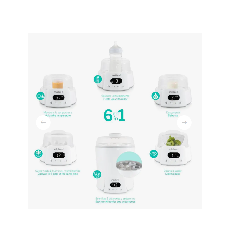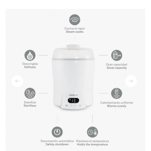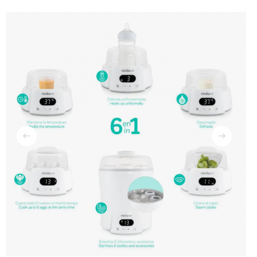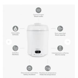 Calientabiberones, esterilizador y vaporera, 6 en 1. Dispositivo multifunción para llevar a cabo un sinfín de tareas de forma ágil y práctica: calienta biberones y potitos de forma gradual, esteriliza y descongela al vapor hasta 6 biberones, cuece huevos y verduras al vapor conservando sus propiedades, mantiene la temperatura de biberones y potitos...