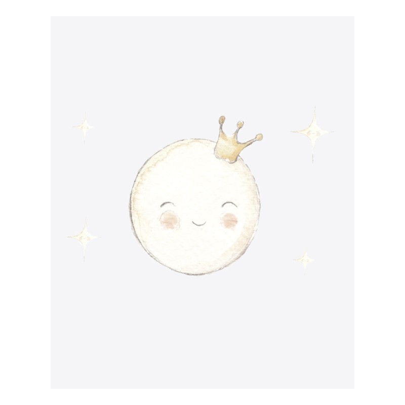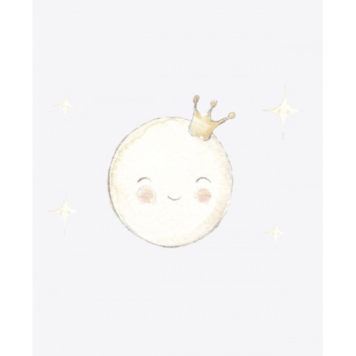 Mágica reproducción de dibujo en acuarela pintada a mano de luna llena con corona rodeade de estrellas. Diseño único y exclusivo de Sueños de Cigüeña.