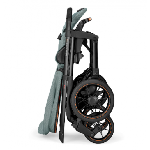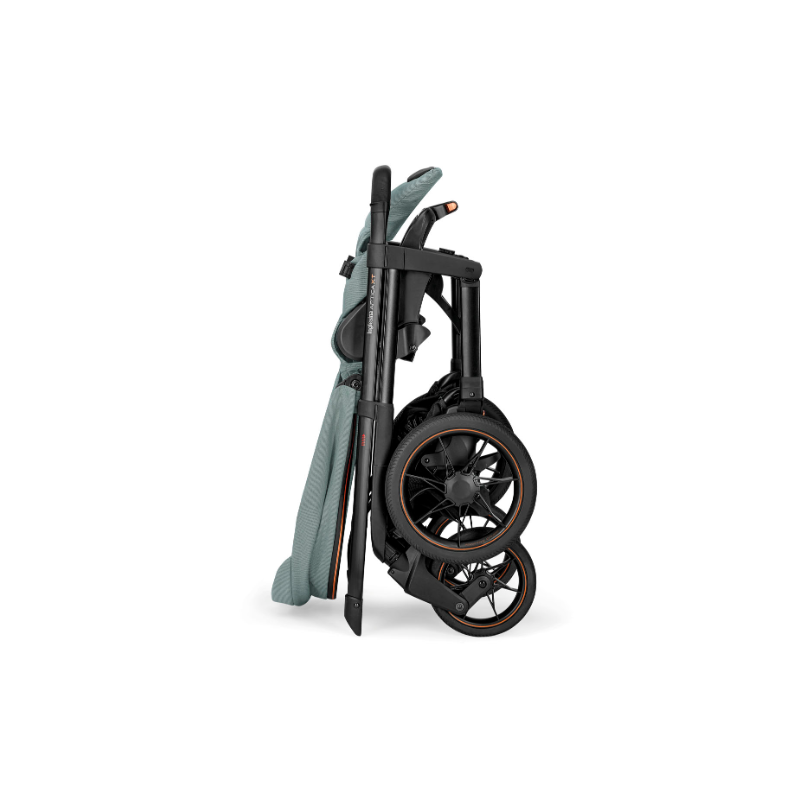 La sillita de paseo puede plegarse como si fuese un «sándwich» tanto con el asiento frente a mamá como frente a la calle, y se mantiene en vertical de forma autónoma.