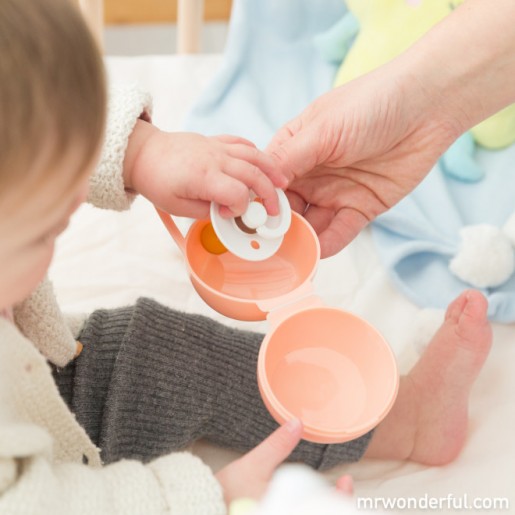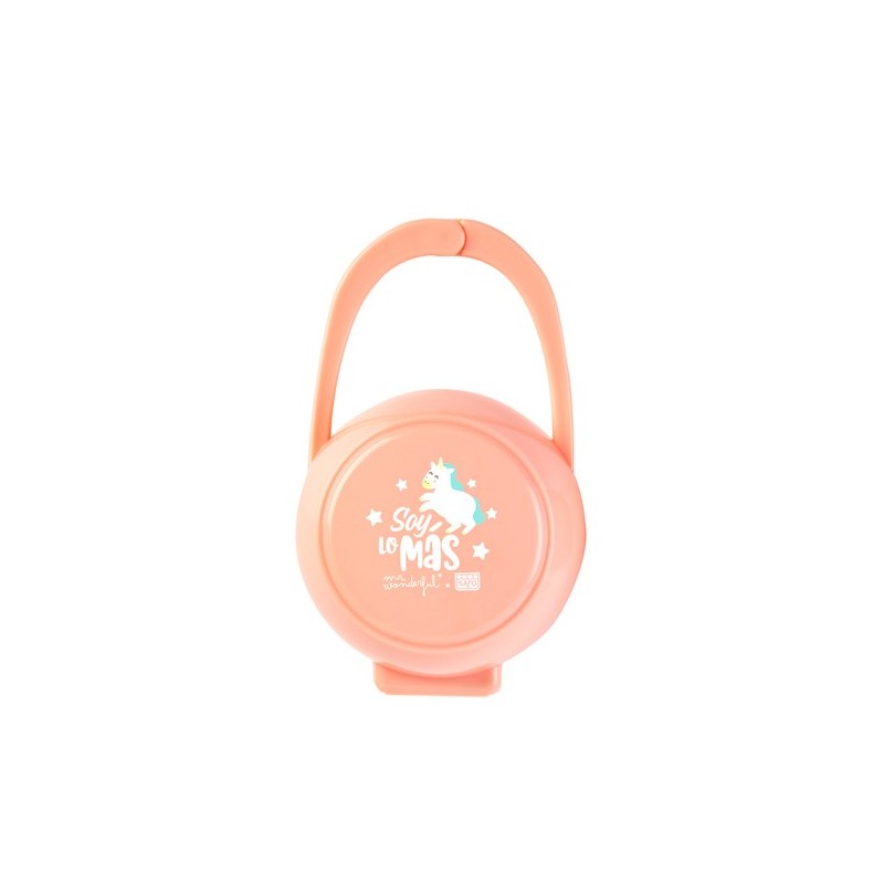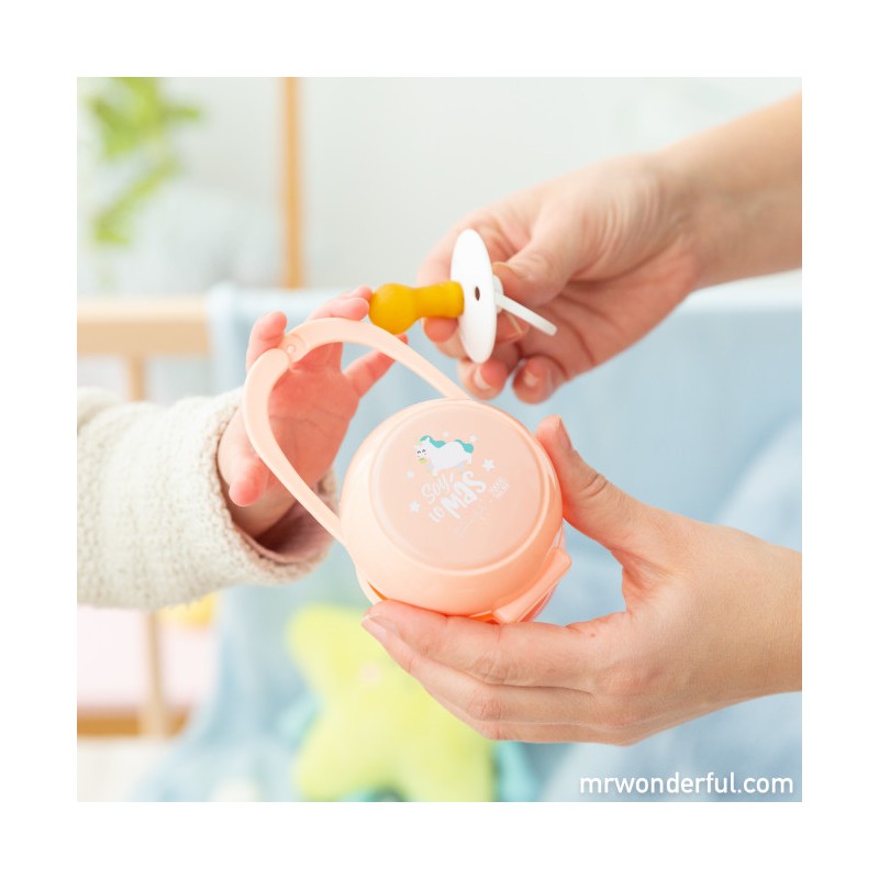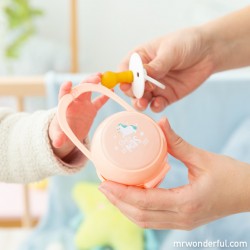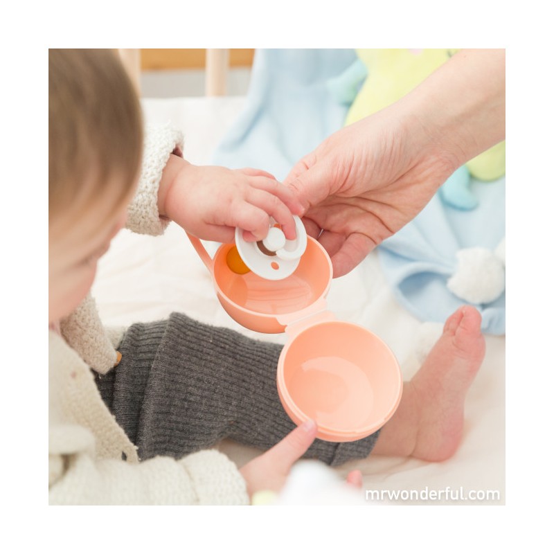 Utiliza la caja portachupetes cuando el niño ya no vaya a utilizar el chupete, así lo mantendrá limpio y a salvo. Su asa permite colgarlo del bolso, el carrito o la cuna hasta el siguiente uso.