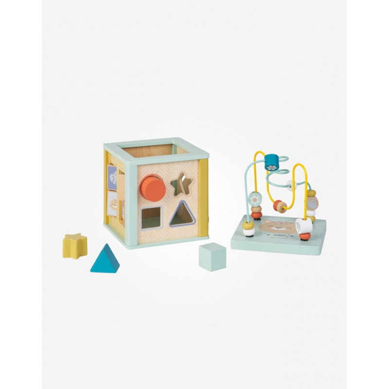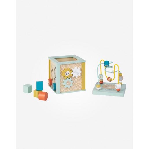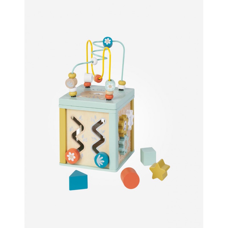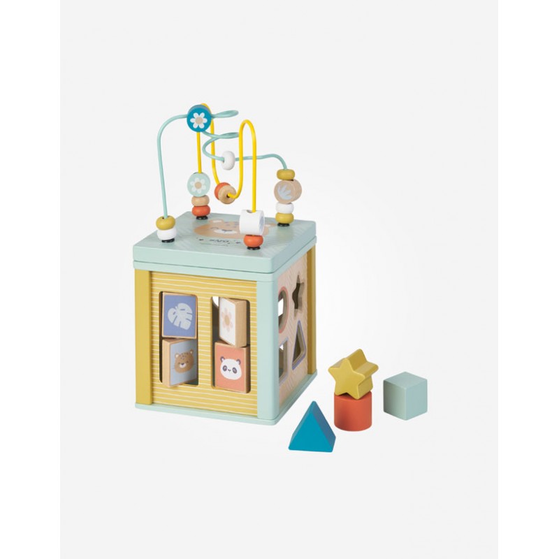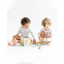 Con este cubo de actividades tan molón tu peque pasará horas de diversión y aprendizaje. En cada una de sus caras irá descubriendo nuevos retos y actividades: engranajes, circuitos, encajables, piezas giratorias y recorridos en zigzag. En la parte superior se encuentra la joya de la corona: un laberinto de cuentas con looping para jugar sin parar.