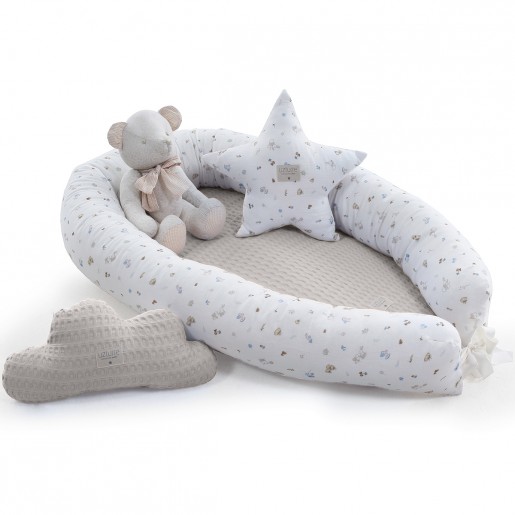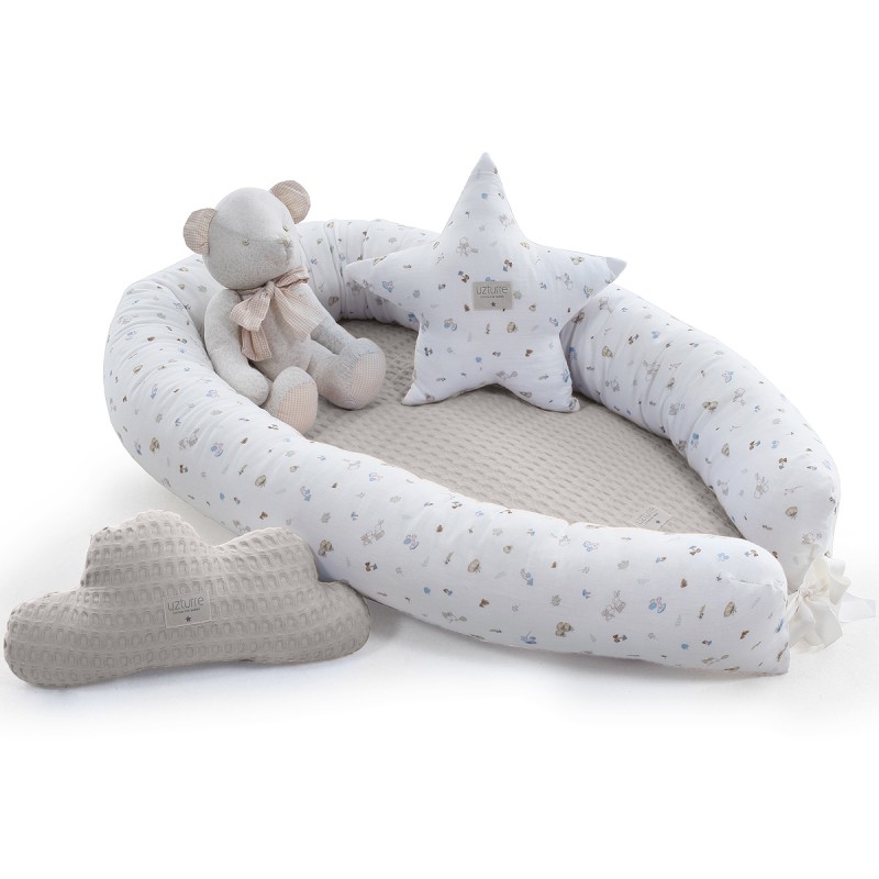 Este cojín nido colecho, es un producto versátil que abraza a su niño y proporciona una atmósfera segura evitando corrientes de aire Se puede utilizar como un reductor en la cuna, como un lugar seguro para jugar en el suelo junto al bebé o en una cuna de viaje Hecho con tejido de algodón 100% transpirable para asegurar que el niño se mantenga seco y cómodo. Totalmente desenfundable con funda de cierre de zip fácilmente lavable. Oeko-Tex Standard 100 certificada, lo que significa que todos los materiales son probados y libres de sustancias nocivas. Si te gusta puedes encontrar otros interesantes artículos de la colección, en esta misma línea con las mismas altas calidades. Todo realizado y diseñado en España con los mejores materiales y los tejidos de la más alta calidad