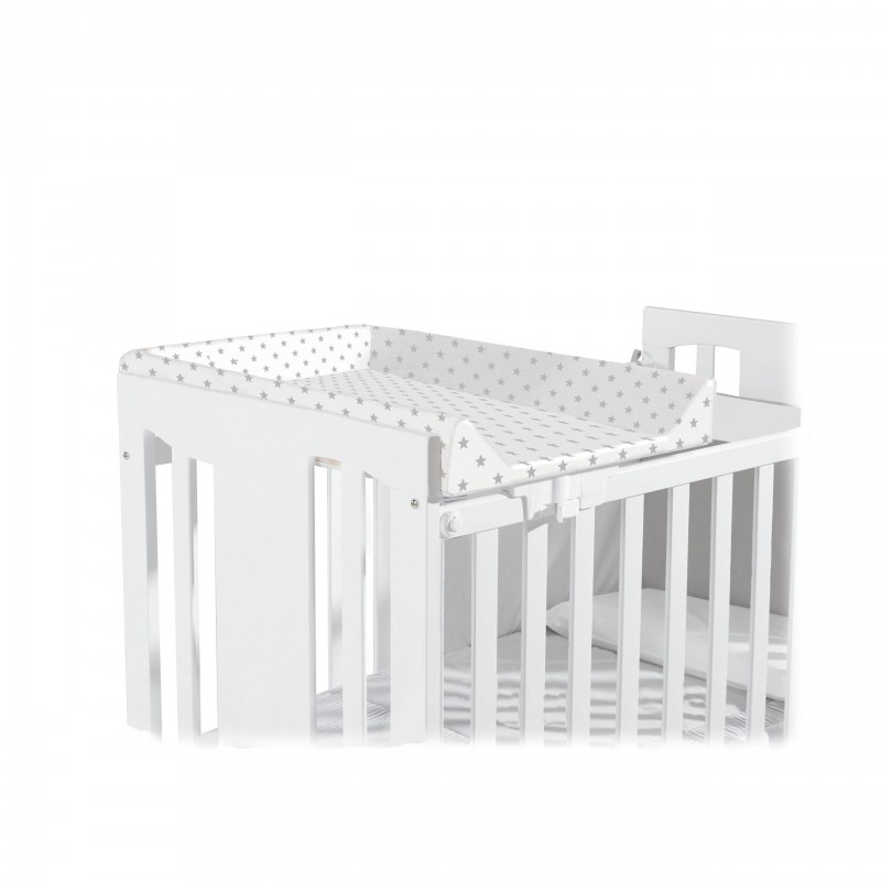 Este cambiador de cuna incluye tapizado de plástico de fácil limpieza, disponible en dos estampados: Estrellas gris y Lunares beige. Todos nuestros productos se diseñan y fabrican en España.