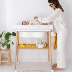 Para facilitar su movilidad, dispone de 4 ruedas, dos de ellas con freno, aunque se pueden quitar fácilmente para hacerla fija. Además, puedes retirar todos los accesorios y transformarla en un moderno y práctico mueble para tu casa o una cómoda para la habitación del bebé.