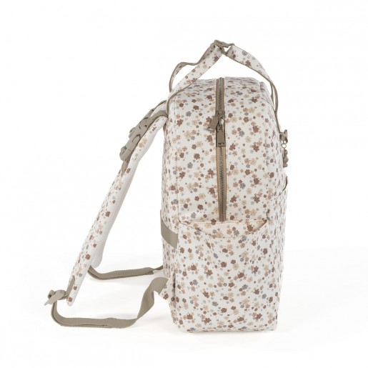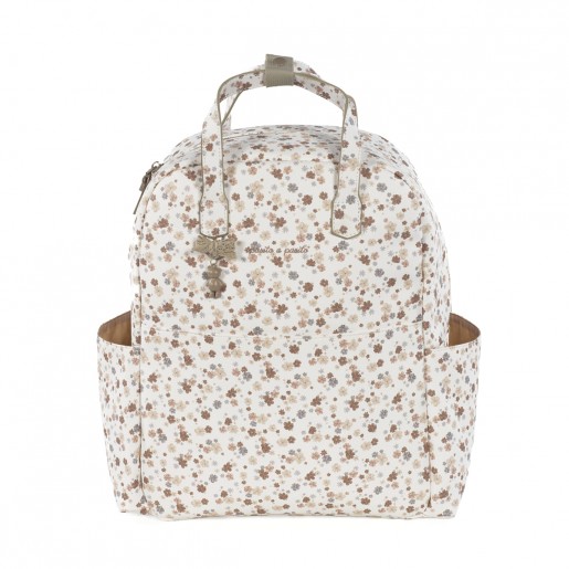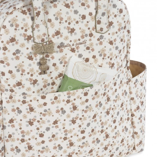Mochila en polipiel impresa Somerset flor. De gran capacidad para llevar todo lo que necesitas tu y tu bebé. Bolsillos interiores y exteriores para tenerlo todo a mano y en orden. Tiene un bolsillo interior térmico para biberones y un bolsillo plastificado para la ropa mojada. Bolsillo exterior frontal y dos bolsillos laterales para botellas o biberones. Tiene 2 asas grandes ajustables para que puedas usarla colgada a la espalda, asas de mano y otras dos asas pequeñas para que puedas usarla colgada del carrito del bebé. Incorpora una cinta trasera para sujetarla a la maleta trolley. Está fabricado con materiales de gran calidad, libres de colorantes azoicos, ftalatos y sustancias nocivas para la salud. Además se puede lavar a mano o a máquina a temperaturas de hasta 30º. Los productos para bebé de Pasito a Pasito cuentan con un diseño muy diferente a todas las demás. Sus colecciones se caracterizan por el trabajo al detallada, pensadas siempre desde un punto de vista práctico. Utilizan materiales de primera calidad para remarcar la elegancia y la armonía en cada una de sus piezas. Nuestros modelos son exclusivos y de estilo inconfundible, pensados para madres actuales que gozan de buen gusto y que aprecian los detalles tanto como nosotros. Especificaciones: Materiales: Eco-leather. Medidas: 30X37X20 cm.