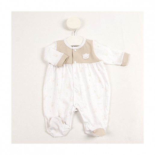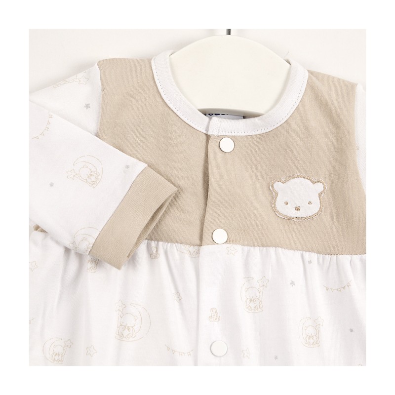 Este adorable pelele combina la suavidad del algodón con un diseño tierno y funcional. El cuerpo en blanco con estampado de ositos se une al canesú en azul pastel con detalle bordado, creando un contraste delicado. Los puños y pies a juego en azul completan el look, mientras que el cierre con automáticos facilita el cambio diario del bebé.