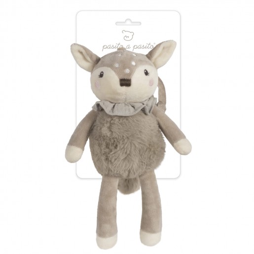 El musical Nara de Pasito a Pasito es el accesorio ideal para relajar y calmar a tu bebé. Diseñado con un adorable ciervo de 26 cm, su suave melodía crea un ambiente de tranquilidad y confort. Perfecto para ayudar a dormir al bebé. Incluye un práctico lazo para sujetarlo en la cuna, el cochecito o la silla de paseo. Confeccionado en velour y tejido de peluche, ideal para el tacto delicado del bebé. Sin piezas pequeñas ni elementos peligrosos, apto para bebés desde recién nacidos. Pasito a pasito protege a tu bebé utilizando los mejores tejidos, libres de colorantes azoicos y sustancias nocivas para la salud. Cumple con la normativa europea EN-71 Seguridad de los juguetes +0 años.