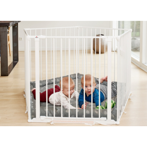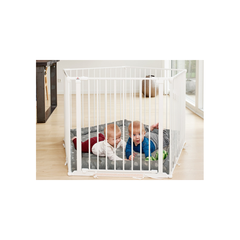 Parque infantil versátil que con un ajuste de pared (de venta por separado), se convierte en Barrera de seguridad. Incluye la alfombra de juego acolchada.
