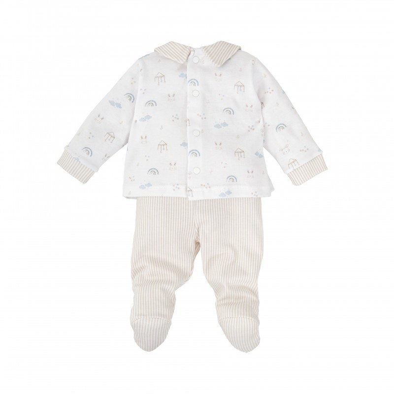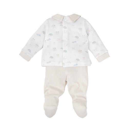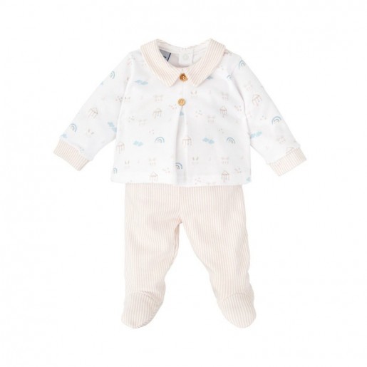 Conjunto de dos piezas para bebé combina fantasía, comodidad y un diseño muy cuidado. La camiseta de manga larga presenta un dulce estampado con arcoíris, nubes, casitas y caritas sonrientes en tonos suaves. El cuello volante a rayas con ribete beige y los botones decorativos en el pecho le aportan un toque elegante y clásico. Se completa con una polaina a rayas verticales beige a juego, con pies cerrados para mantener al bebé abrigado. Una opción perfecta para el día a día con estilo y ternura.