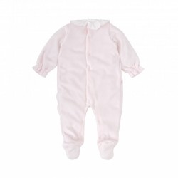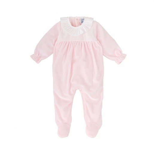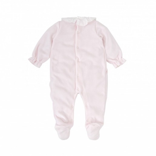 Dulce pelele de terciopelo rosa palo, ideal para mantener a tu bebé cómodo y abrigado. Destaca su delicado canesú blanco bordado con topitos y su coqueto cuello volante a juego. Las mangas terminan en un fruncido suave con lazada, aportando un toque elegante y muy cuqui. Se abre fácilmente por la espalda y la entrepierna con corchetes para facilitar el cambio.