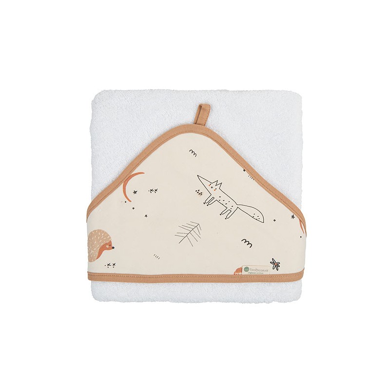 Capa de Baño Bimbidreams maravillosamente suave al tacto, está confeccionada en toalla de rizo 100% algodón, de estilo contemporáneo y colorido. Cuenta con un espacio destinado para la cabeza donde presenta un alegre estampado en tonos terrosos, verdes y anaranjados donde las jirafas, palmeras y elefantes cobran vida sobre el suave fondo blanco a juego con la colección.